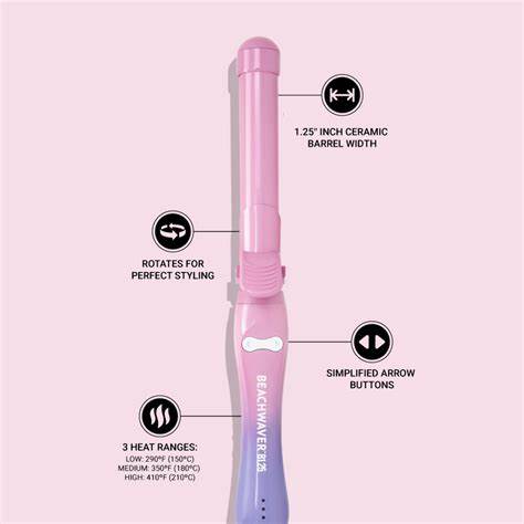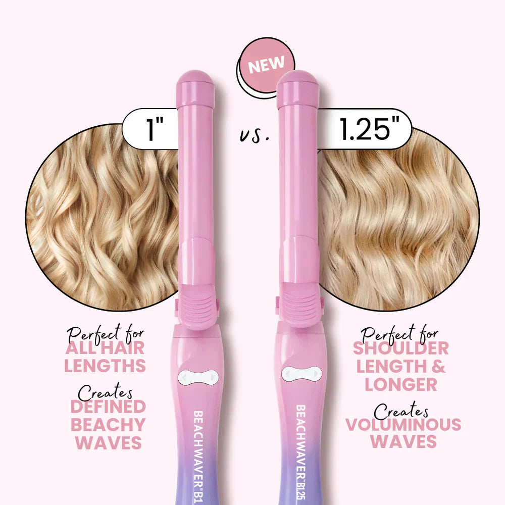 The Beachwaver B1.25 Pink Sunset, is perfect for all hair types, lengths, and textures. Designed with two arrow buttons to rotate curls in both directions, our signature short clamp, which is beveled for smooth curling and no kinks, as well as three pre-set heat ranges.
