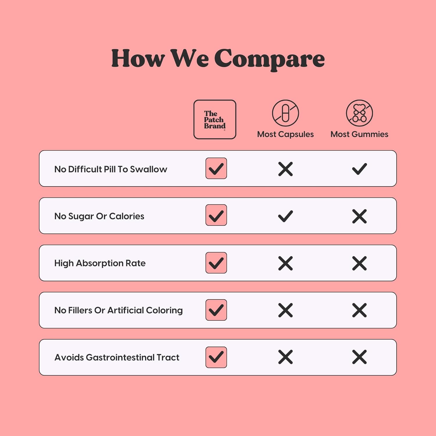• OUT OF SIGHT AND MIND: The Patch is comfortable to wear, and you won't even notice it's there. Each responsibly sourced patch is water resistant and latex free, not to mention gluten free and vegan. Unlike pills, capsules, and gummies, The Patch is effortless to take and lasts for up to 24 hours. You get all day health benefits without having to swallow a pill.