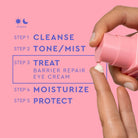 - Massage 1 pump in circular motions around eye area, then gently tap into skin.