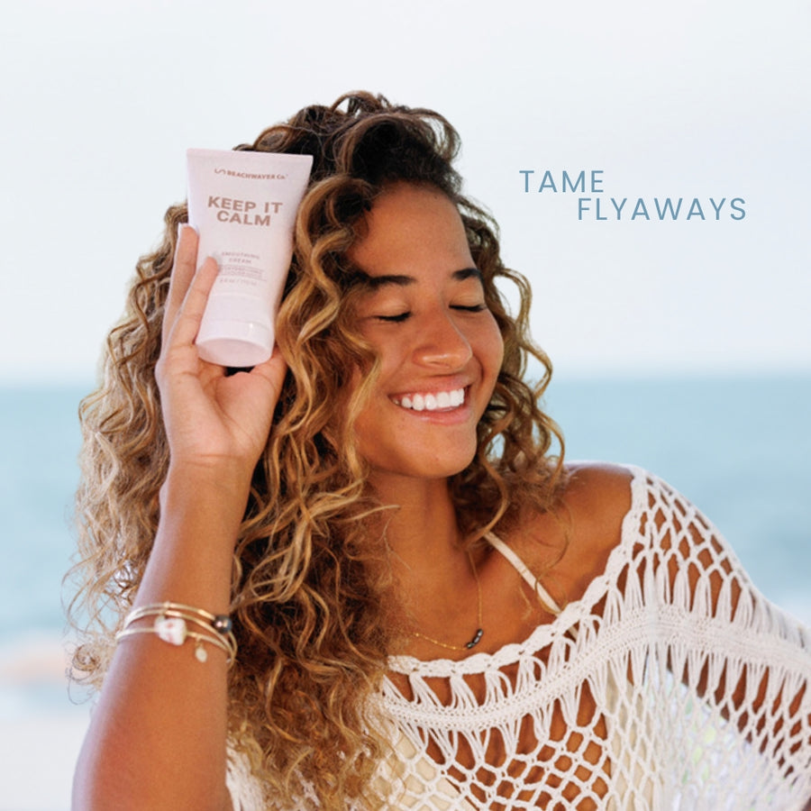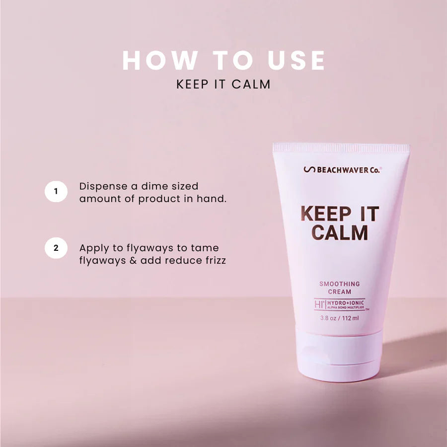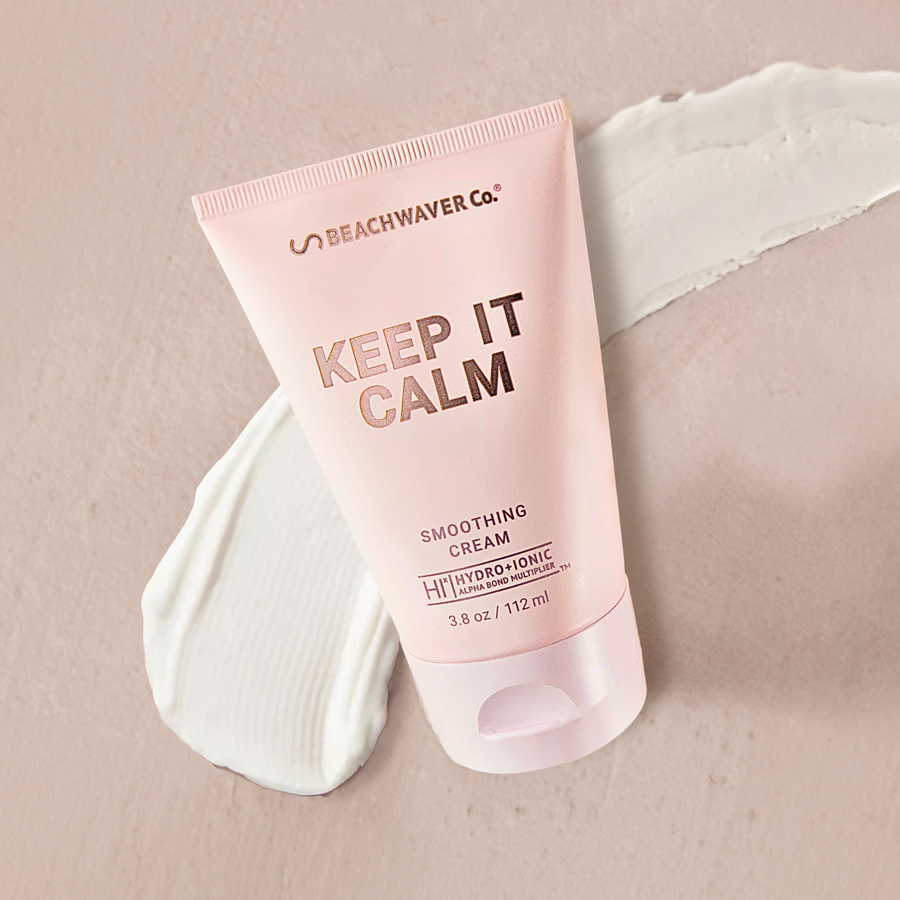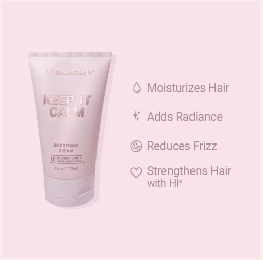 The Beachwaver Co.'s Keep It Calm Smoothing Cream is a lightweight styling product designed to tame flyaways, reduce frizz, and add shine to your hair. Infused with HIx Bond Multipliers and coconut milk, it helps build strength and seal the hair cuticle for a sleek, polished look.